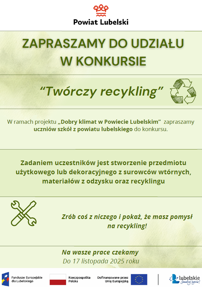 Starostwo Powiatowe w Lublinie zaprasza uczniów szkół z terenu powiatu lubelskiego do udziału w konkursie pn. „Twórczy recykling" organizowanego w ramach projektu „Dobry klimat w Powiecie Lubelskim".
