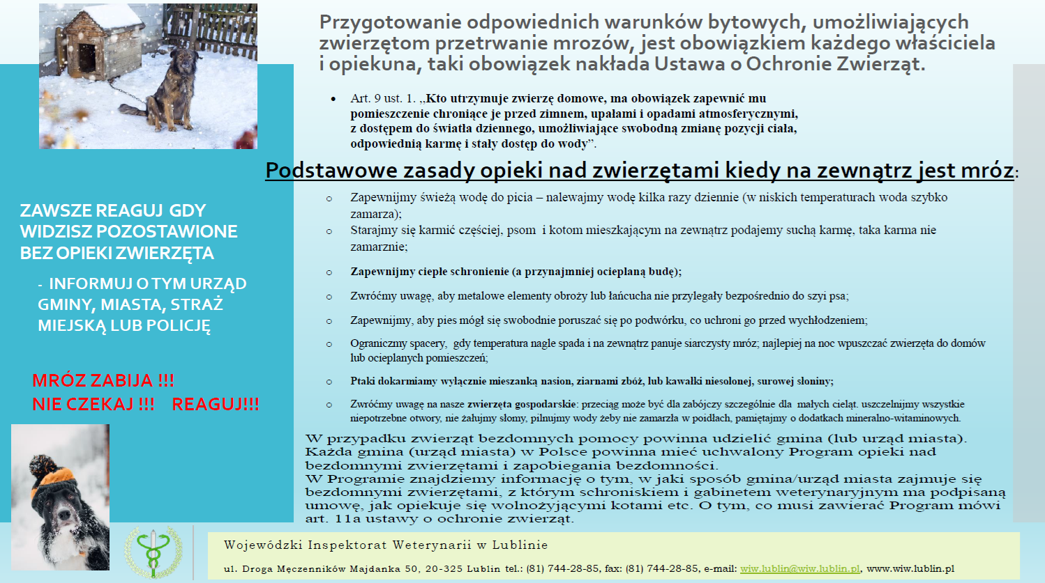 Na prośbę Powiatowego Lekarza Weterynarii w Lublinie publikujemy ulotkę informacyjną zawierającą podstawowe zasady opieki nad zwierzętami podczas niekorzystnych warunków atmosferycznych.