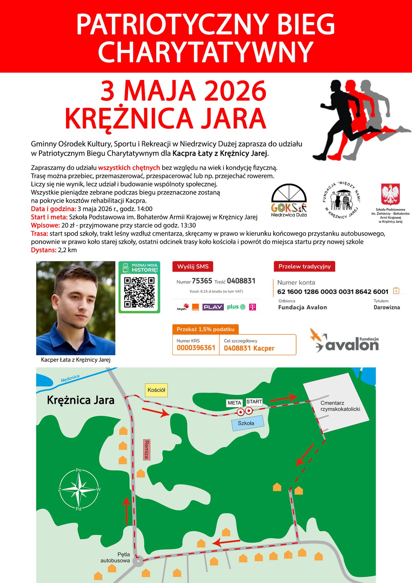 14:00 - Patriotyczny Bieg Charytatywny dla Kacpra Łaty z Krężnicy Jarej. Wpisowe – 20 zł będzie przyjmowane od uczestników biegu od godz. 13:30.