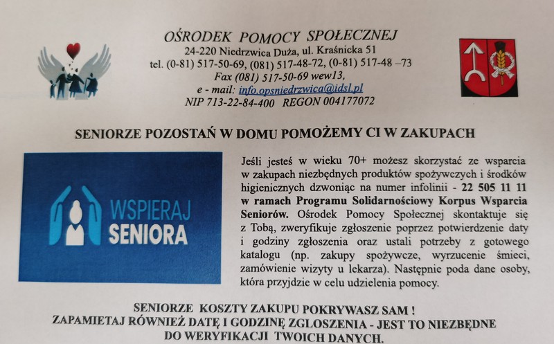 Prosimy o rozeznanie wśród mieszkańców, czy są osoby wymagające niniejszej formy wsparcia. Wsparciem mogą być objęte osoby w wieku 70 lat i więcej, samotni lub których rodzina z uzasadnionych przyczyn nie może zrobić zakupów. Usługi obejmują głównie zakupy artykułów spożywczych (z wyjątkiem alkoholu), leków, środków czystości, umówienie wizyty u lekarza. Ze wsparcia w uzasadnionych przypadkach mogą również skorzystać osoby młodsze.