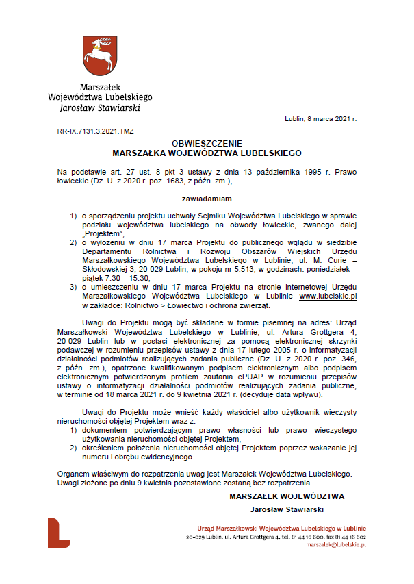 Obwieszczenie Marszałka Województwa Lubelskiego z dnia 08 marca 2021 roku