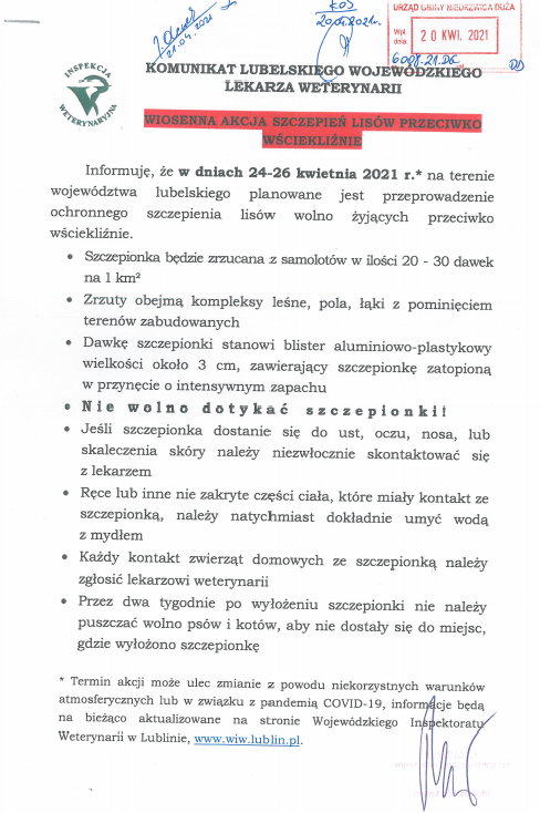 Komunikat Lubelskiego Wojewódzkiego Lekarza Weterynarii nt. Wiosennej akcji szczepień lisów przeciwko wściekliźnieArchiwum