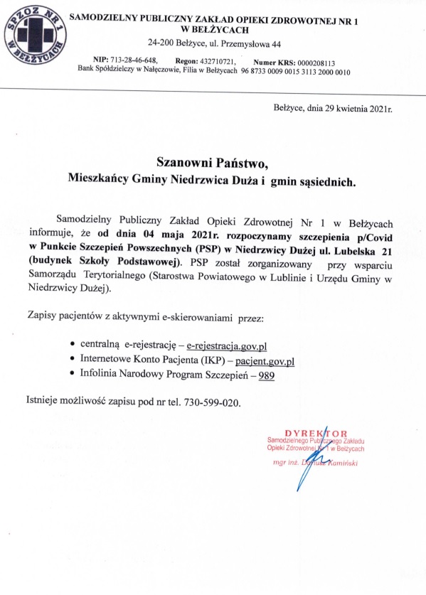 W związku z otrzymaniem pozytywnej decyzji o utworzeniu Masowego Punktu Szczepień w gminie Niedrzwica Duża przekazujemy pismo od Dyrektora Samodzielnego Publicznego Zakładu Opieki w Bełżycach. Wszystkie osoby zainteresowane szczepieniem w MPS Niedrzwica Duża proszone są o wypełnienie kwestionariusza wstępnego wywiadu przesiewowego przed szczepieniem przeciw COVID-19.