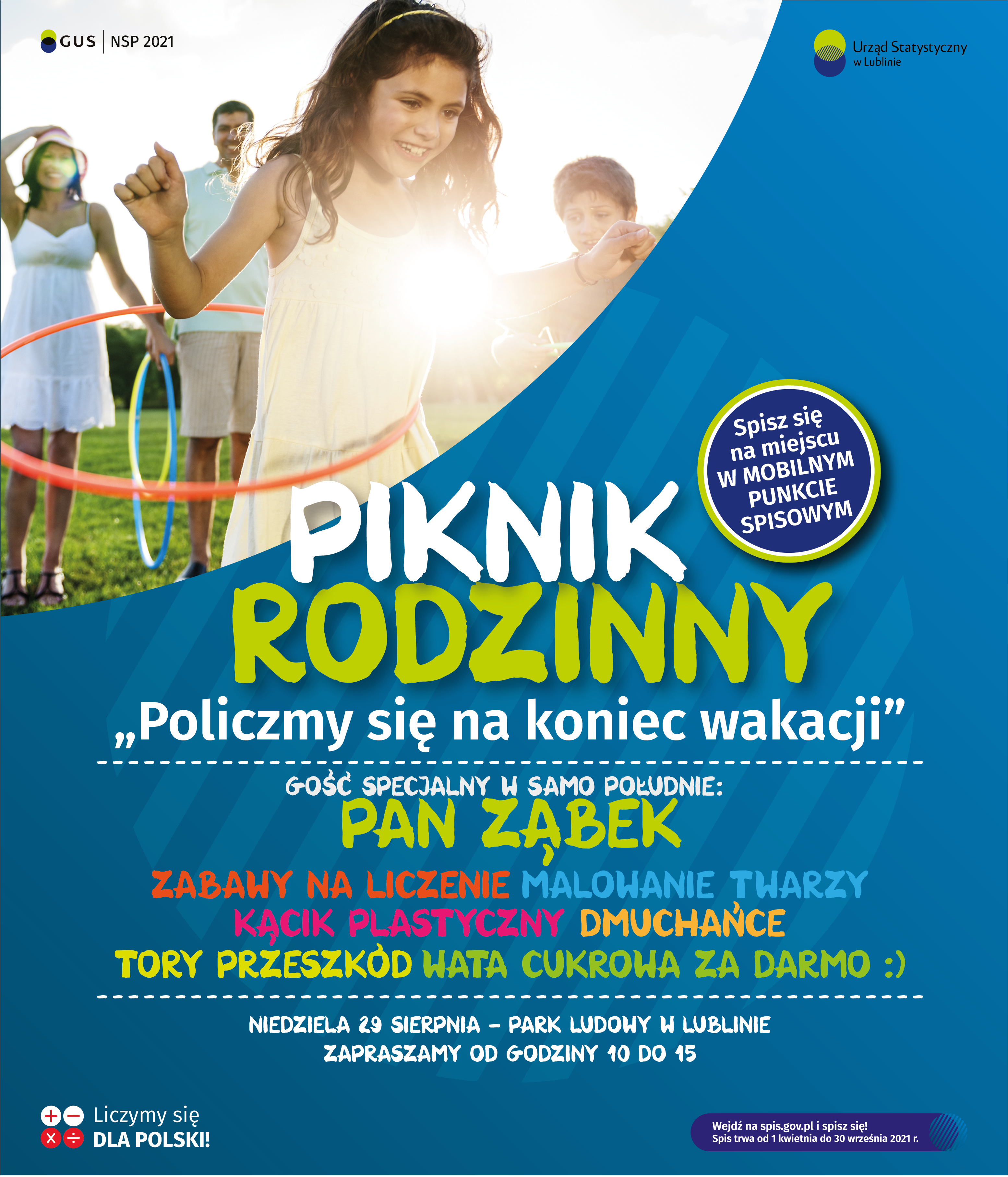 Urząd Statystyczny w Lublinie zaprasza w najbliższą niedzielę (29 sierpnia) w godzinach od 10:00 do 15:00 do Parku Ludowego w Lublinie na Piknik rodzinny "Policzmy się na koniec wakacji".