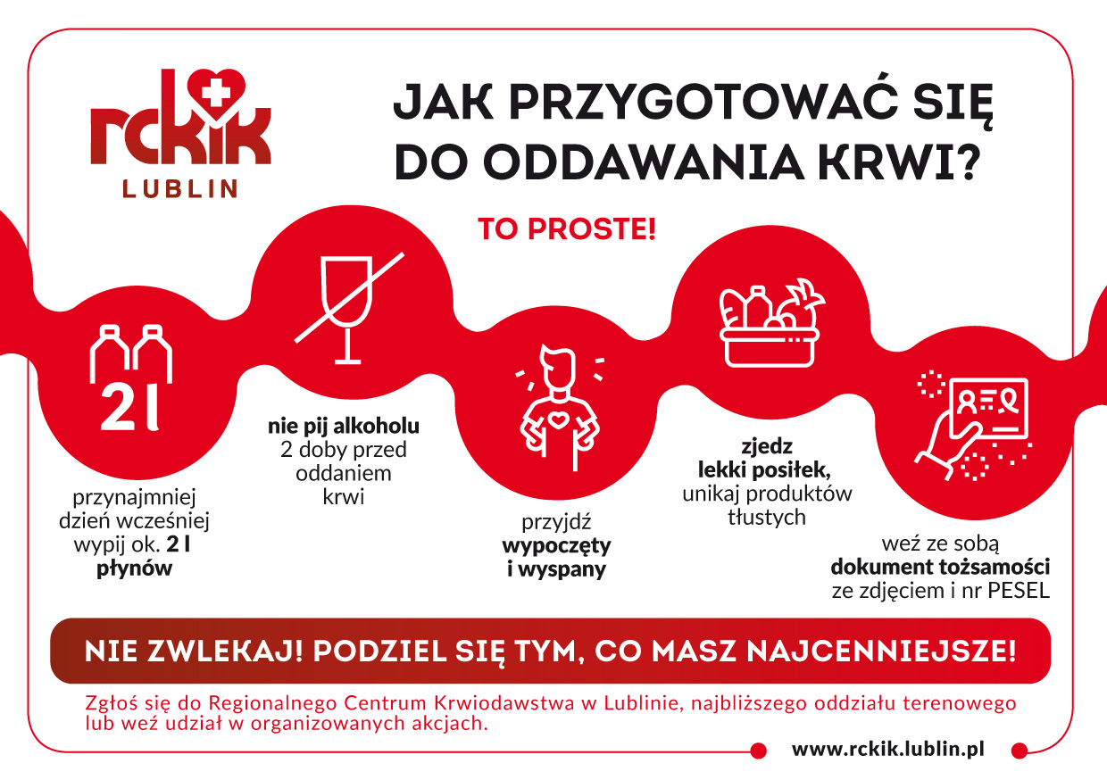 Dodatkowych informacji udziela Regionalne Centrum Krwiodawstwa i Krwiolecznictwa w Lublinie - ul. Żołnierzy Niepodległej 8: centrala: 81-532 62 75, sekretariat: 81-532 53 18.