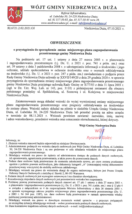 Obwieszczenie Wójta Gminy Niedrzwica Duża z dnia 7 października 2021 r. w sprawie przystąpienia do zmiany miejscowego planu zagospodarowania przestrzennego gminy Niedrzwica Duża dla obszaru położonego pomiędzy ul. Spółdzielczą, ul. Sosnową i ul. Kolejową w miejscowości Niedrzwica Duża.