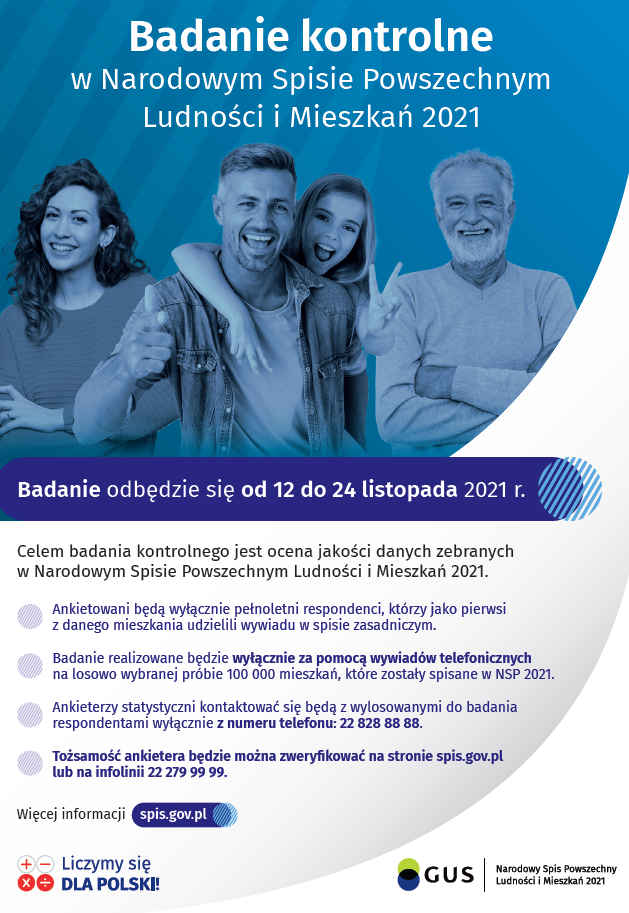 Szanowni mieszkańcy, informujemy że od 12 do 24 listopada 2021 roku, Główny Urząd Statystyczny będzie prowadził badanie kontrolne w Narodowym Spisie Powszechnym Ludności i Mieszkań w 2021 r. Badanie ma na celu oszacowanie błędu pokrycia i jest podstawowym sposobem oceny danych uzyskanych w ramach NSP 2021.