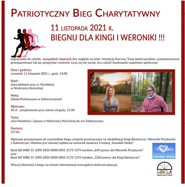 Gminny Ośrodek Kultury, Sportu i Rekreacji w Niedrzwicy Dużej (GOKSiR) zaprasza do udziału w Patriotycznym Biegu Charytatywnym dla Kingi Bartoszcze i Weroniki Przybycień. Bieg odbędzie się 11 listopada 2021 r., start o godz. 14.00 spod starej plebanii przy ul. Parafialnej w Niedrzwicy Kościelnej. Pobiegniemy trasą o dystansie 3,9 km ulicami: Parafialną i Lipową do wsi Sobieszczany. Meta biegu będzie przy Szkole Podstawowej w Sobieszczanach.