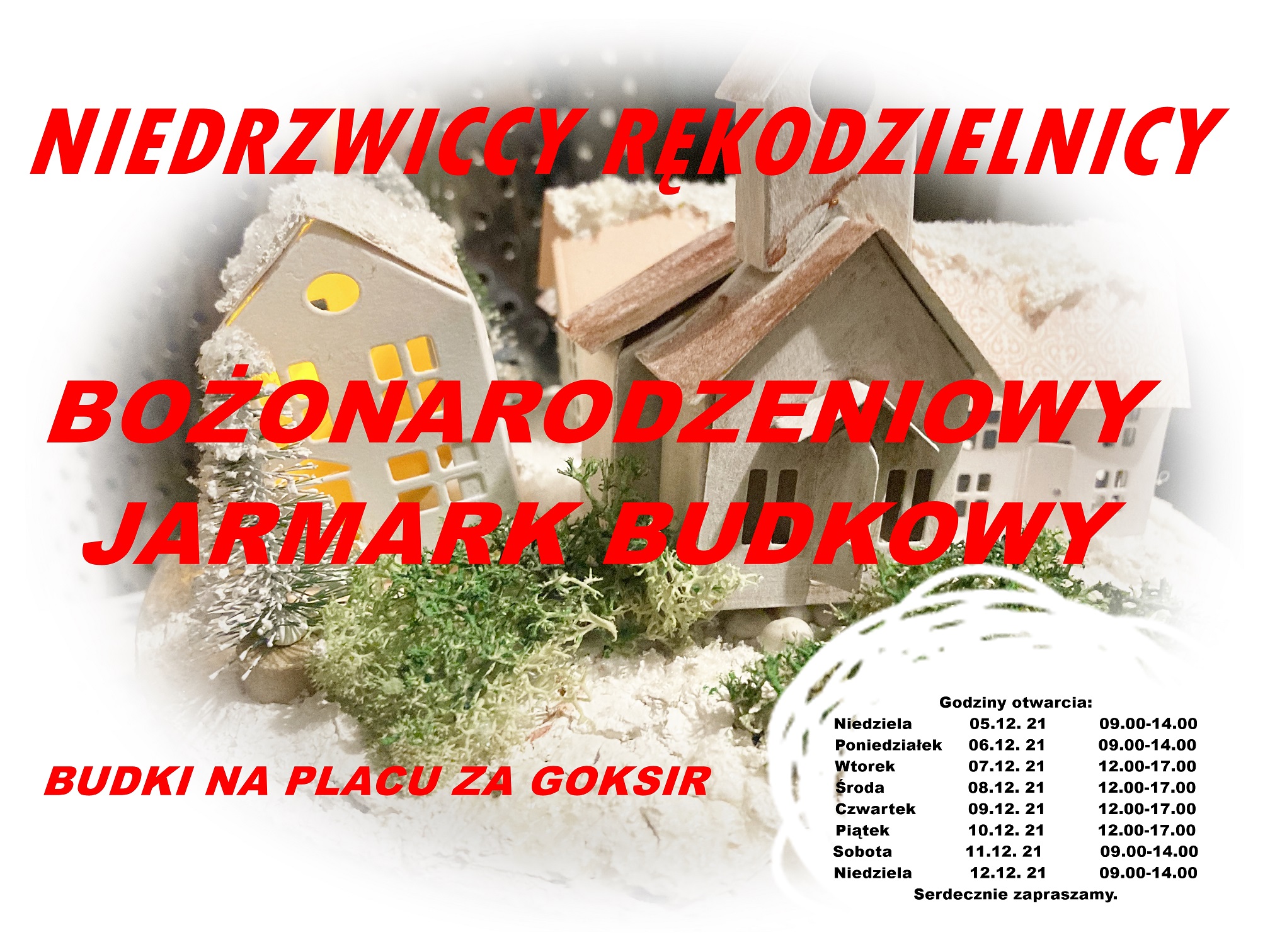 W budkach wystawienniczych swoje dzieła zaprezentują niedrzwiccy rękodzielnicy. Będzie można zakupić m.in. naturalne stroiki, miód i jego pochodne, wyroby szydełkowe, bombki choinkowe, szeroki asortyment rzeczy ceramicznych (użytkowych i ozdobnych), obrazy na płótnie, skrzynie i pudełeczka ozdobione w technice decoupage.