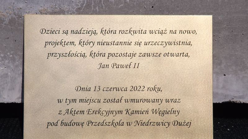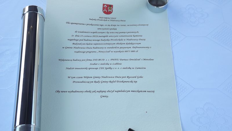 W dniu 13 czerwca 2022 roku odbyło się uroczyste podpisanie Aktu Erekcyjnego i wmurowanie kamienia węgielnego pod budowę nowego Przedszkola w Niedrzwicy Dużej.