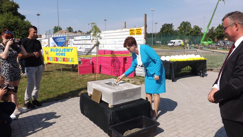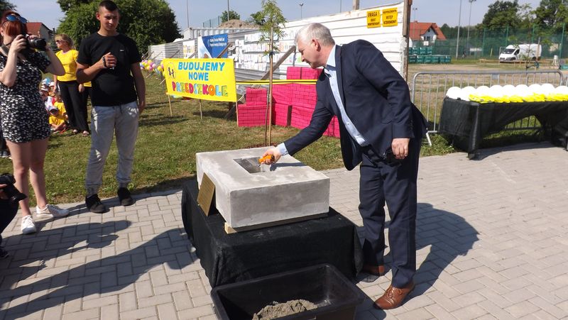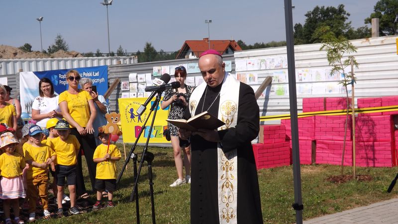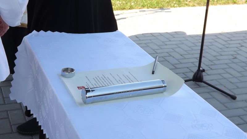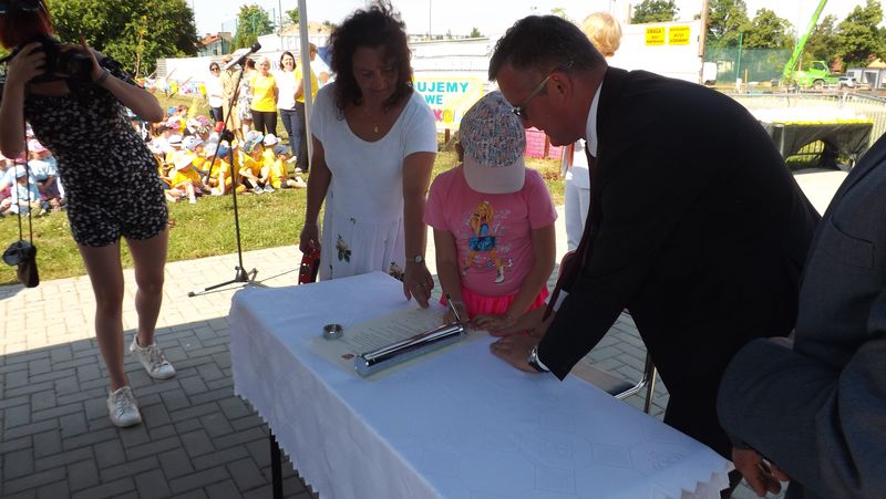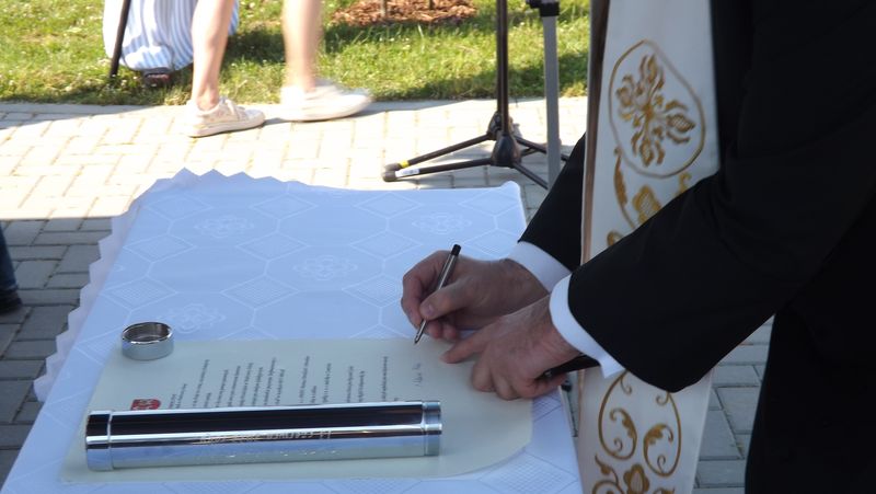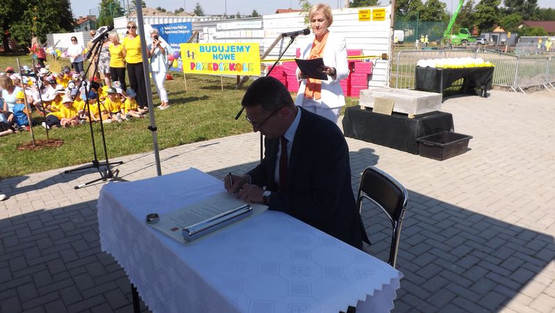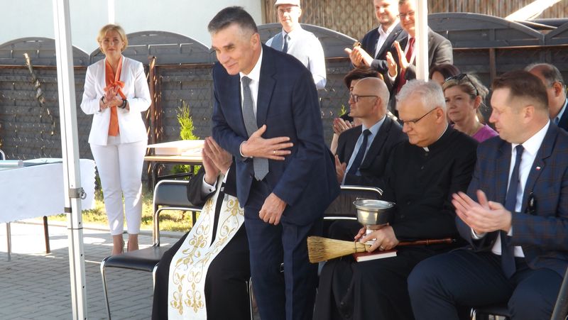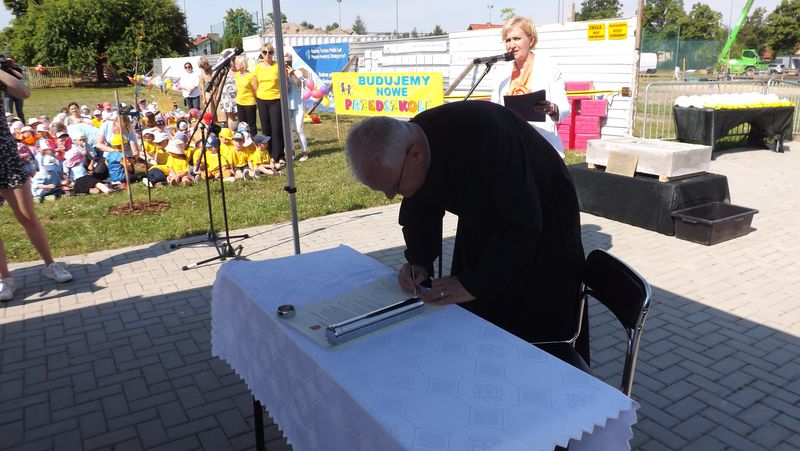 Po przywitaniu przez Pana Wójta Ryszarda Golca zaproszonych gości, Ksiądz Biskup poświęcił kamień węgielny. Następnie wszyscy zaproszeni goście podpisali Akt Erekcyjny i nastąpiło uroczyste wmurowanie kamienia. Później przyszedł czas na przemówienia. Przemawiali: Pan Wojewoda, Pan Starosta, Pani Dorota Zwolak oraz Pan Wójt.