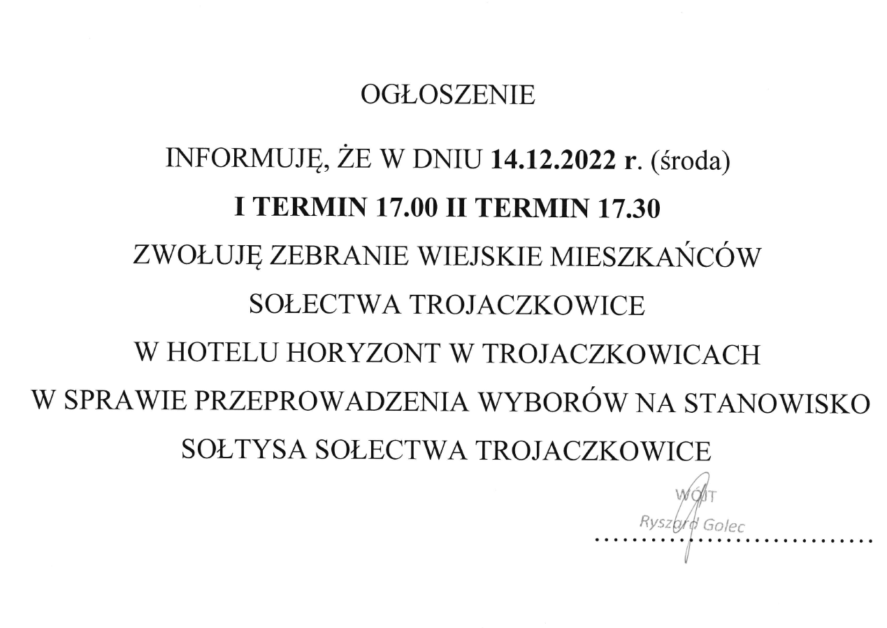 Ogłoszenie w sprawie przeprowadzenia wyborów na stanowisko Sołtysa sołectwa TrojaczkowiceArchiwum