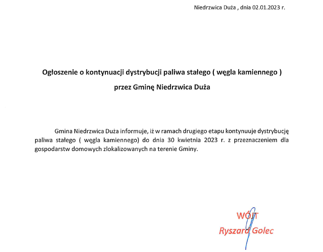 Ogłoszenie o kontynuacji dystrybucji paliwa stałego (węgla kamiennego) przez Gminę Niedrzwica DużaArchiwum