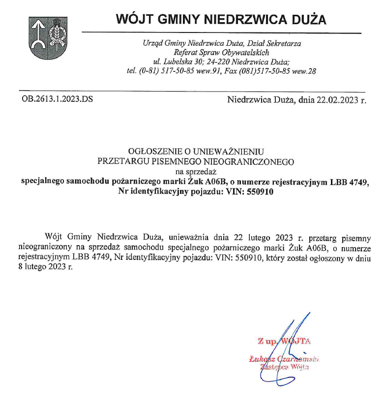 Ogłoszenie o unieważnieniu przetargu pisemnego nieograniczonego na sprzedaż specjalnego samochodu pożarniczego marki Żuk A 06B