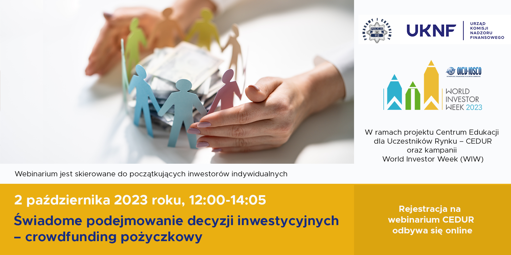 Urząd Komisji Nadzoru Finansowego zaprasza na webinarium „Świadome podejmowanie decyzji inwestycyjnych – crowdfunding pożyczkowy" - 2 października 2023 roku.