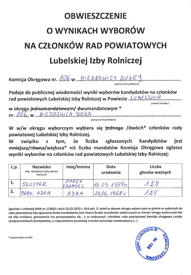Poniżej publikujemy Obwieszczenie Komisji Okręgowej w Niedrzwicy Dużej o wynikach wyborów na członków rad powiatowych Lubelskiej Izby Rolniczej.
