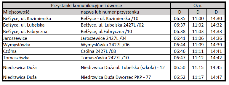 Informujemy, że od dnia 2 października 2023 r. obowiązywać będą nowe rozkłady jazdy komunikacji publicznej na trasie Niedrzwica Duża – Czółna – Bełżyce oraz Niedrzwica Duża – Łączki-Pawłówek - Bełżyce.