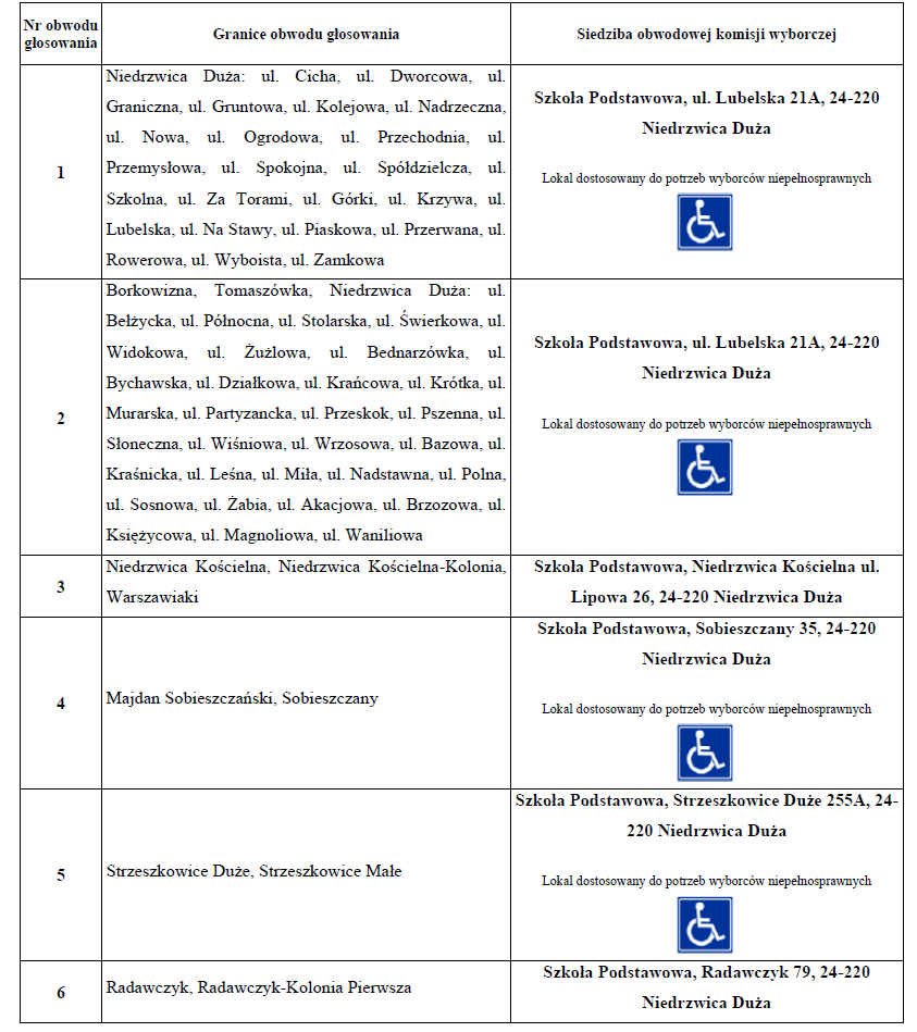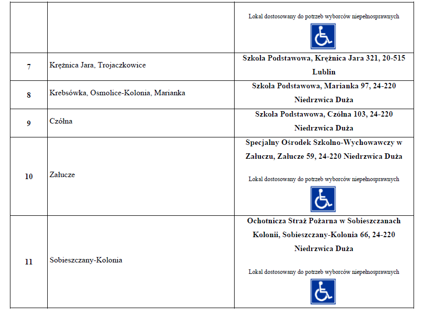 Ponadto informujemy, że na terenie gminy Niedrzwica Duża utworzone zostały dwa NOWE obwody głosowania - Obwodowa Komisja Wyborcza nr 10 w Załuczu (Specjalny Ośrodek Szkolno-Wychowawczy, Załucze 59) dla mieszkańców sołectwa Załucze oraz Obwodowa Komisja Wyborcza nr 11 Sobieszczanach Kolonii ( Remiza OSP Sobieszczany Kolonia 66) dla mieszkańców sołectwa Sobieszczany Kolonia.