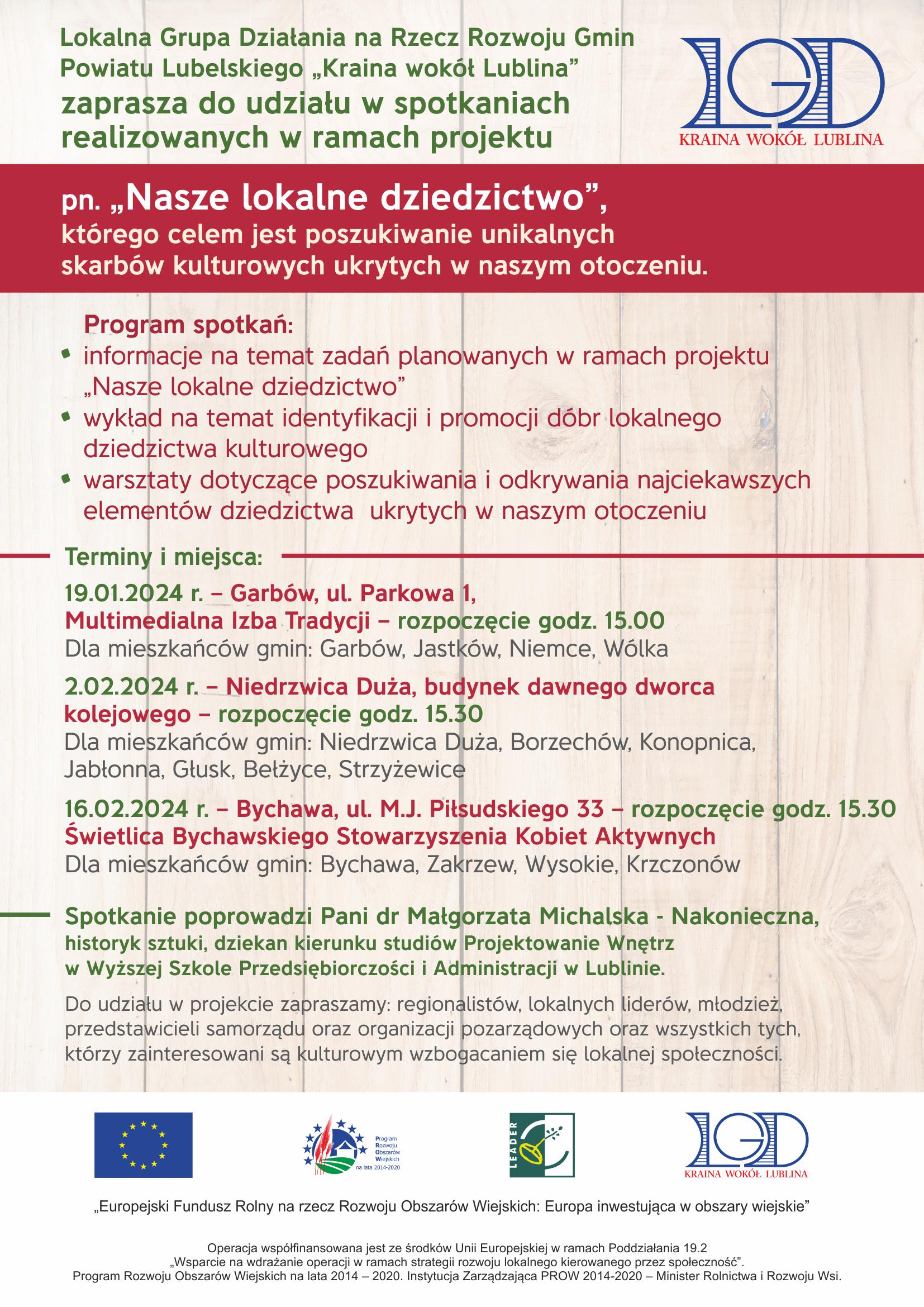 Lokalna Grupa Działania na Rzecz Rozwoju Gmin Powiatu Lubelskiego „Kraina wokół Lublina” zaprasza do udziału w spotkaniach realizowanych w ramach projektu „Nasze lokalne dziedzictwo”, którego celem jest poszukiwanie unikalnych skarbów kulturowych ukrytych w naszym otoczeniu.