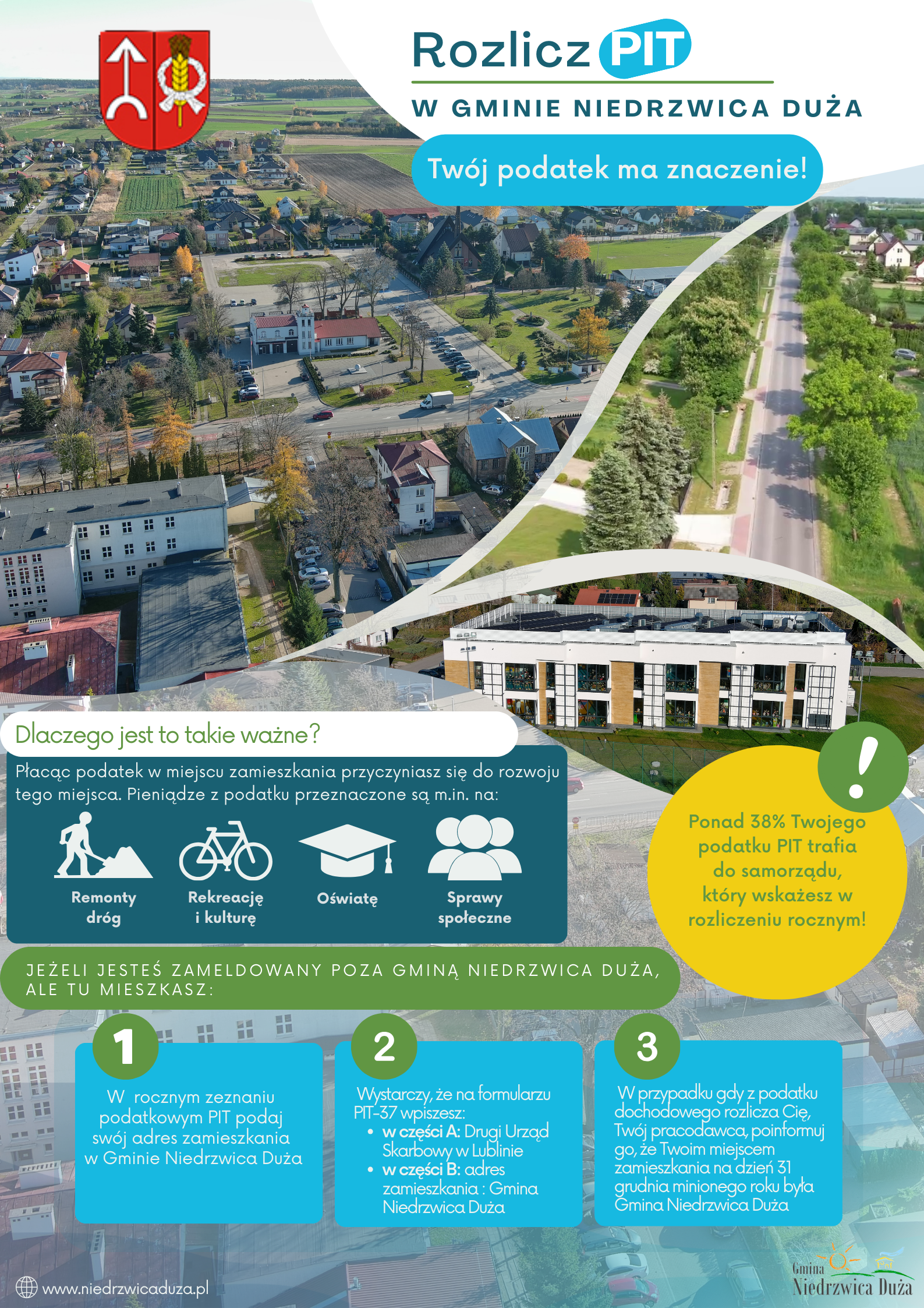 Ponad 38% z podatku dochodowego od osób fizycznych, zapłaconego przez mieszkańców w 2023 roku, może zasilić budżet gminy Niedrzwica Duża. Oznacza to, że z każdego 1.000 zł, które nasi mieszkańcy odprowadzają do urzędu skarbowego, około 381 zł wraca do nich m.in. w postaci gminnych inwestycji. Warunkiem jest dokonanie rozliczenia rocznego PIT ze względu na miejsce zamieszkania.