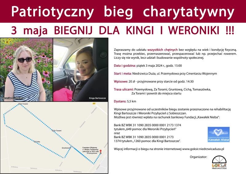 3 maja odbędzie się Patriotyczny Bieg Charytatywny „Biegnij dla Kingi i Weroniki!!!”. Start o godz. 15.00 spod Cmentarza Wojennego z I Wojny Światowej przy ul. Przemysłowej w Niedrzwicy Dużej. Wpisowe w wysokości 20 zł przyjmowane będzie od uczestników biegu na starcie od godz. 14.30. Trasa o dystansie 5,5 km obejmuje ulice: Przemysłową, Za Torami, Gruntową, Cichą, Tomaszówka, ponownie Za Torami i powrót do miejsca startu. Wyznaczoną trasę można przebiec, przemaszerować, przespacerować albo przejechać rowerem. Wszystkie pieniądze zebrane podczas biegu przeznaczone zostaną na pokrycie kosztów rehabilitacji Kingi Bartoszcze i Weroniki Przybycień z Sobieszczan.