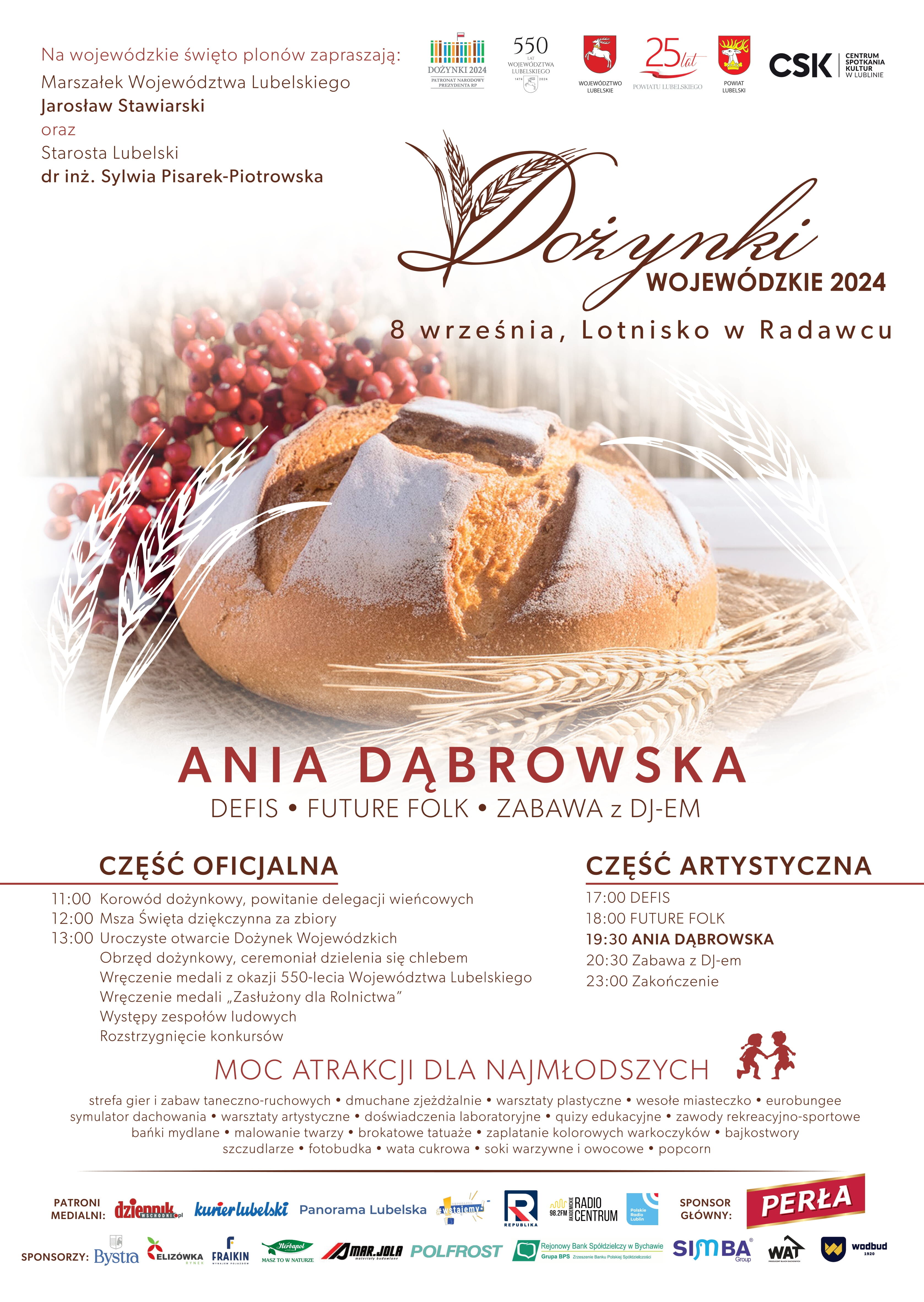 Serdecznie zapraszamy wszystkich mieszkańców gminy Niedrzwica Duża i gości na tegoroczne święto plonów, które odbędzie się 8 września (niedziela) na terenie lotniska w Radawcu Dużym. To wyjątkowe wydarzenie, pełne tradycji i radości, uświetnią występy gwiazd polskiej sceny muzycznej!