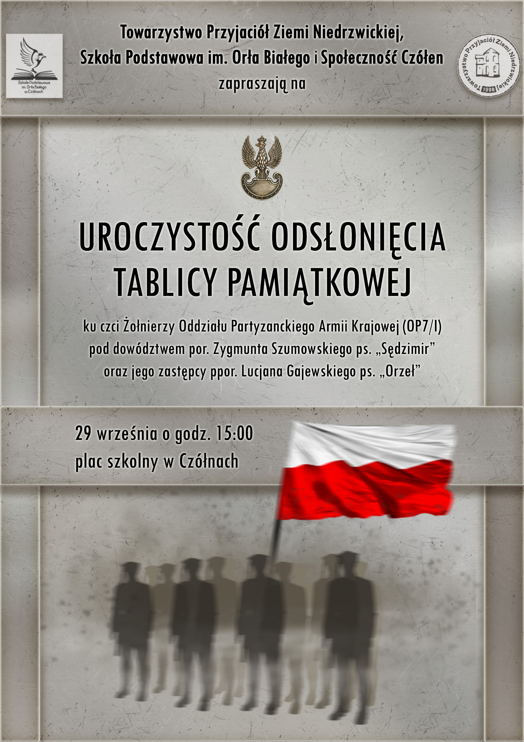 W imieniu organizatorów serdecznie zapraszamy na uroczystość odsłonięcia tablicy pamiątkowej ku czci Żołnierzy Oddziału Partyzanckiego Armii Krajowej. Uroczystość odbędzie się 29 września na placu przy Szkole Podstawowej w Czółnach.