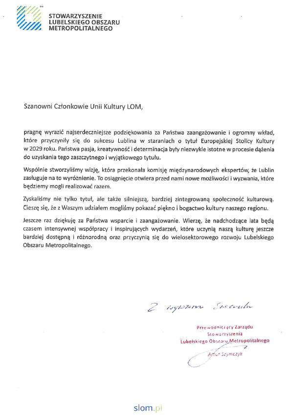 Poniżej publikujemy list Pana Artura Szymczyka - Przewodniczącego Zarządu Stowarzyszenia Lubelskiego Obszaru Metropolitalnego.