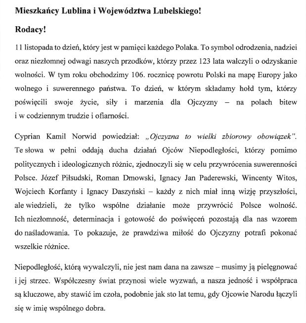 Odezwa Komitetu Honorowego Obchodów Narodowego Święta Niepodległości 11 listopada w Województwie LubelskimArchiwum