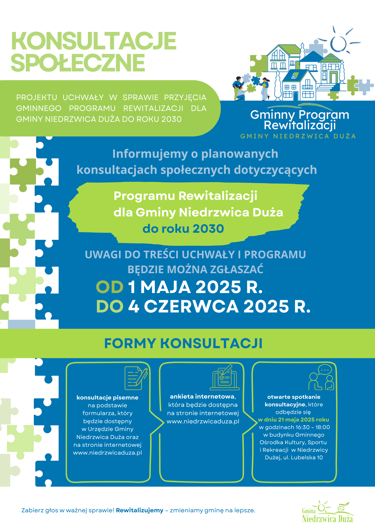 Informacja o planowanych konsultacjach społecznych projektu uchwały w sprawie przyjęcia Gminnego Programu Rewitalizacji dla Gminy Niedrzwica Duża do roku 2030